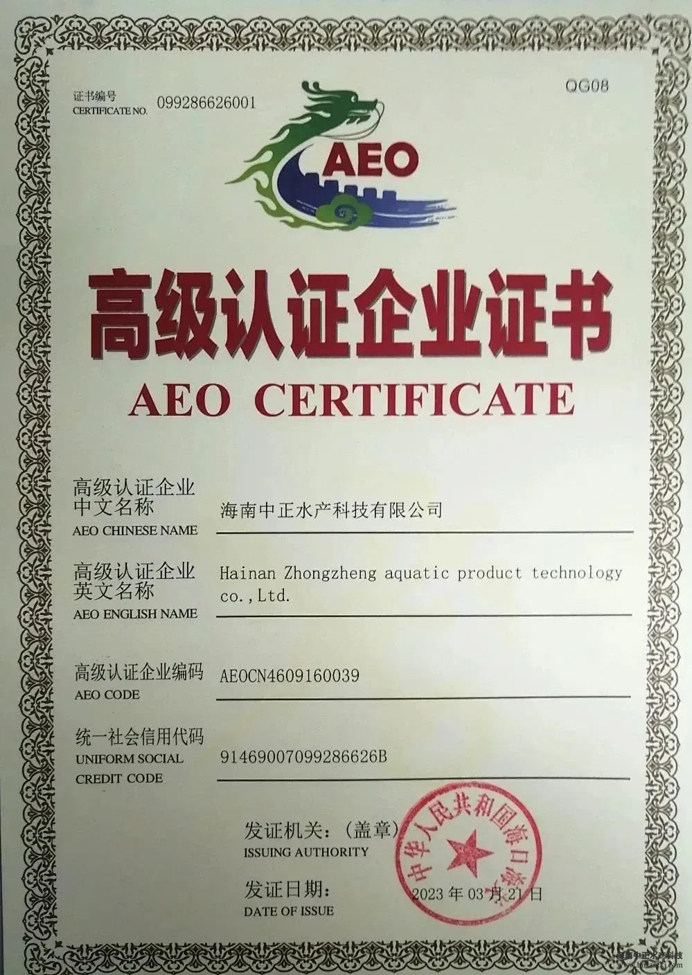 海南中正水產(chǎn)科技有限公司于2023年3月獲批成為海關(guān)AEO高級認(rèn)證企業(yè),成為海南省首家水產(chǎn)種業(yè)進(jìn)出口為主的AEO認(rèn)證企業(yè)。